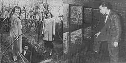![]() "Photo taken in the Abel I. Smith Cemetery shows Melvin McClure, Anita Koch, Beatrice Irving at the underground vault. It has been proposed to make a park of the site." – Home News Photo | |