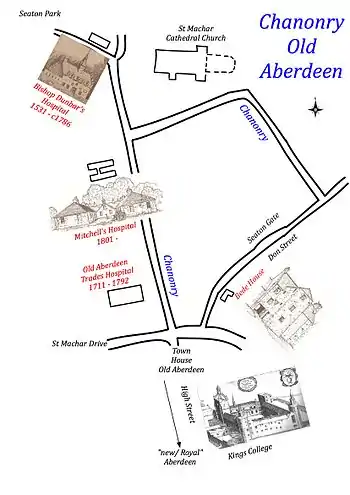 - ↑ NB – by this time David Mitchell had founded his Hospital for "Auld Maids" in Old Aberdeen. Further, the Trustees of Bishop Dunbar's Hospital (1531) then located in Don Street, Old Aberdeen also began to use their income to support Bedesmen in the community.