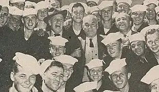 Hollandersky's long career with the Navy included work as an independent supply boat operator or "bum boater" from which he sold magazines and newspapers to the fleet. His boat was a small motorized dingy that was rumored to have been given to him by Admiral Robley Evans. Early in his career, Abe saved several people from drowning and rescued stranded boats in Gardiner Bay off the docks of New London while "bum boating" for the Navy. "Bum boating" consisted of taking a small launch out to naval vessels and selling newspapers, magazines, and small supplies to Navy personnel. In his small launch, he also performed tasks such as delivering mail to naval ships.[49] In his mid-career with the Navy, he worked as a boxing instructor for sailors at the pier in New London near the end of WWI, and as a recruiter of 1,700 naval personnel in WWII while he was living in Los Angeles. He also gave boxing exhibitions and training, and sold newspapers to Naval ships during his world cruises. After cruising to California in 1925, Abe helped the Navy provide relief for the aftermath of the Santa Barbara earthquake that struck on June 25, 1925. He raised War Bonds in WWII, occasionally capitalizing on his contacts with former boxers, and entertainers, such as Jimmy Durante, with whom he had worked in a movie. He later assisted the Navy in providing relief following the March 10, 1933 Los Angeles area earthquake that had an epicenter near Long Beach, California, where he had his news stand. He was caught in the earthquake on the day it struck, and narrowly escaped injury.[50] By 1947, the Navy bestowed on Abe the "Award of Merit" for his recruiting of both men and women for WWII.[51]