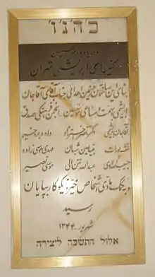 Abrishami Synagogue (Persian: كنيسهء ابريشمى Kanise ye Abrishami, Hebrew: בית הכנסת אברישמי) is a synagogue in Tehran, Iran. It was built in September 1965 in the upper-middle-class neighborhood of Kakh Shomali (currently N. Palestine Street). The land on which the synagogue-school compound was built was granted by the Iranian Jewish philanthropist, Aghajan Abrishami and is 1,025 square meters (approximately 11,040 square feet) in size. A foundation was originally created by the name of Tzedek Cultural Foundation whose mission was to oversee the building and operations of the Abrishami Synagogue-School Compound. The founding members of the foundation were: Aghajan Abrishami, Nasser Akhtarzad, David Berukhim, Menashe Purat, Benjamin Shaban, Mehdi Musazadeh, Habib Lavi, (Hacham) Abdollah Netan Eli and Musa Nassir.[1]