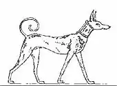 Although no images of Abuwtiyuw have been found, the text characterizes him as ṯzm (Tesem), a lightly built hunting dog similar to a greyhound, with erect ears and a curly tail. The Tesem dog features in predynastic depictions, making it one of the oldest known breeds of dog, and images of it are common throughout Ancient Egyptian history.[25] According to Reisner, the name Abuwtiyuw is not fully translatable, but he surmised that ꜥbw ("abuw") is an onomatopoeic representation of a dog's bark, as this component often is found in Ancient Egyptian dog names.[25] Edward C. Martin Jr. claims that the name means 'With Pointed Ears', which would fit the description of the Tesem.[2]