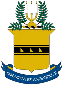The crest of Acacia depicts a three-taper candelabrum surrounded by a wreath of Acacia. Below a shield of old gold, on fess cottised sable three 3-4-5 right triangles. Below the shield is a blue ribbon holding the motto of the fraternity in Greek: ΩΦΕΛΟΥΝΤΕΣ ΑΝΘΡΩΠΟΥΣ ("Human Service" or "In Service of Humanity").[3]