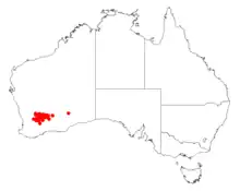 The shrub native to an area in the Wheatbelt and Goldfields-Esperance regions of Western Australia and is found between Bruce Rock in the west to Coolgardie in the east. It is found on sandplains growing as a part of heath or scrubland communities in sandy soils.[1]