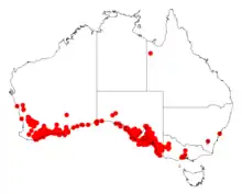 It is native to an area mostly along the coast in South Australia, western Victoria and the Goldfields-Esperance, Great Southern, South West and Wheatbelt regions of Western Australia. It is often situated on sand plains, along drainage lines and in and around clay pans growing in sandy-clay soils often around limestone[2] and as a part of mallee communities.[3]