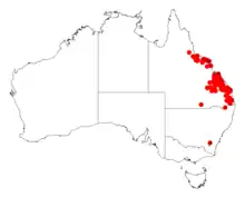 It is found in Queensland from Boonah in the south up to around Bowen in the north with the bulk of the population situated between Boonah and Rockhampton. It is found on ridges and along creek lines growing as a part of Eucalyptus woodland communities.[1]
