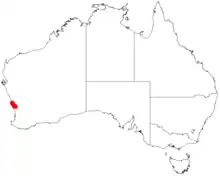 It is endemic to a small area on the west coast area in the Wheatbelt region of Western Australia between Coorow and Dandaraganwhere it is found on hills, breakaways and in gullies growing in gravelly clay loam soils over laterite or sandstone.[3] It is often part of heath or low woodland communities composed of an overstorey of Eucalyptus wandoo and Eucalyptus calophylla with understorey scrub including Hakea lissocarpha and other species of Grevillea, Acacia, Isopogon, Calothamnus and Melaleuca.[2] The plant has a limited range over a distance of around 80 km (50 mi) with the two main populations located near Dandaragan and Jurien Bay with much of the population in Lesueur National Park.