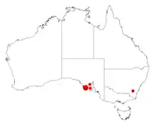 It is found in a small area of South Australia in southern parts of the Eyre Peninsula from around Port Lincoln to around Ungarra where it grows in clay or loamy soils as a part of open scrub communities and is associated with Eucalyptus diversifolia and Eucalyptus phenax.[1]
