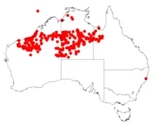 In Western Australia it is scattered throughout the Kimberley and Pilbara regions of Western Australia usually on rocky ranges and plateaus, among sand dunes and on sand plains growing in red sandy and stony soils.[2] It is also found in the Northern Territory and extends into far western Queensland.[1]