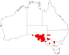 The shrub is native to the Broken Hill district of arid far western New South Wales as well as Victoria and South Australia.[1] The bulk of the population is found in South Australia where the shrub is considered to be quite common. In South Australia it is found on the Eyre Peninsula, the Flinders Ranges, the Mount Lofty Ranges and the Yorke Peninsula as well as more arid areas inland. It is usually found growing in hard and shallow calcareous, alkaline, red or brown coloured duplex soils as a part of low woodland or open scrubland communities.[2]