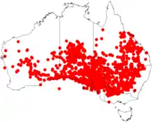 It is native to an area in the central and southern regions of South Australia and the Northern Territory, south west Queensland, western New South Wales,[6] northern Victoria[2] and the Pilbara and Goldfields-Esperance regions of Western Australia.[4]