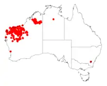 The plant is found in the Pilbara, Kimberley and northern parts of the Mid West regions of Western Australia where it is situated along watercourses, on plains and lower slopes and along road-sides growing in sand or loamy clay or alluvial sand or skeletal soils often over or around sandstone.[3] Its range extends from around Carnarvon in the west to around Meektharra in the south to Rudall River National Park in the east and Wallal Downs in the north. It is also found near Windjana Gorge to around Halls Creek in the southern part of the Kimberley.[2]