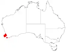 It is native to a small area in the South West region of Western Australia where it is commonly situated on sandplains or in swampy areas growing in clay or sandy soils, sometimes over laterite.[1] the range of the shrub extends from around Yarloop in the north down to around Collie and the Whicher Range in the south where it found growing in open heathland surrounding swamps in open jarrah forest communities.[2]