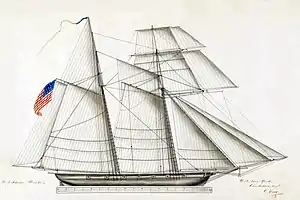 The band of pirates was relatively large, consisting of around 125 men and three armed schooners. One schooner, Revenge, was an 80-ton vessel armed with five cannon and 35 men; a second, 90-ton schooner had six guns and 30 men; a third vessel measured 60 tons, was armed with three cannon and manned by 60 men.[3] The pirates also manned five American prizes. These were the ship rigged vessel William Henry from New York, the brigs Iris and Sarah Morril from Boston, and a pair of merchant schooners, one hailing from Rochester, Massachusetts, and the other from Salem.[4]