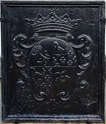 Blazon: Quarterly, at 1 of argent a lion sable; at 2 and 3 of azure semy of fleurs-de-lis Or and canton of argent charged with a martlet in sable; at 4 of gules a cinquefoil in argent (Rietstap, Europe).[9]