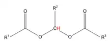 Acylals in organic chemistry are a group of chemical compounds sharing a functional group with the general structure RCH(OOCR)2. Acylals are obtained by reaction of carbonyls with acetic anhydride or other acid anhydrides and a suitable catalyst, for instance with sulfated zirconia[1] at low temperatures when used as protective groups for aldehydes. High temperature exposure converts the acylal back to the aldehyde.