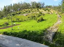 Excavations show the fortress to be of oval shape, 250 metres (820 ft) in length, 30 to 80 m (98 to 262 ft) in width, and with a wall at a height of 6–8 m and a thickness of about 2.7 m; the wall towers were 10 m high.[2] This structure represented a major fort of the Claustra Alpium Iuliarum, a network of forts and walls to securing Roman Italy from eastern invasions, including the road between Roman Italy and Pannonia. It was typically manned with 500 soldiers.