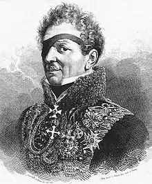 He participated in the Battle of Jemappes, Battle of Neerwinden, and Siege of Valenciennes. On 14 September 1794, at the village of Doel, on returning from one of many missions to deliver secret instructions to forts in the Dutch Republic, he became trapped behind enemy lines and received such serious bayonet wounds that he was left for dead; he lost his right eye in this skirmish. The following day, while burying the dead, the French found him still breathing and hospitalised him. Speaking French rather too well for a common soldier, he was assumed to be a traitor and sentenced to be shot once his health had returned. However, his convalescence was lengthy due to the seriousness of his injuries. By the time he recovered, the command having changed, he became part of a prisoner exchange. In a different account, he lost his eye not to a saber wound sustained in battle, but as a result of his maltreatment while being held prisoner by the French.[1] He was unable to return to active duty for over a year. Neipperg rejoined the Austrian army and took part in the Battle of Mainz in 1795, and led Austrian troops in Italy, culminating at the disastrous Battle of Marengo in 1800 that drove the Austrians out of Italy. Following Marengo, Major Neipperg went to Paris in July 1800 as secretary to Feldmarschallleutnant Graf St. Julien, who was conducting peace negotiations with the French. When these failed in the autumn, he was appointed to 5th Ott Hussars on 1 December, distinguishing himself at the Battle of Pozzolo on 25 December. As the Oberstleutnant (Lt-colonel) of the same regiment, he fought in NE Italy again in the 1805 campaign, notably in the rearguard action on the Tagliamento. In 1806 he was appointed Oberst (colonel) of the regiment and directed the Neutrality and Frontier Cordon force, which observed the 1806-7 war.[2]