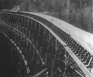 In order to move logs from the plateau above the Lower river, Adams River Lumber constructed several flumes. The flumes were elevated wooden troughs filled with water that floated logs down to the valley bottom. The largest of these was at Bear Creek. It incorporated trestles up to 25 metres (82 ft) high and was capable of moving 3,000,000 metres (9,800,000 ft) of logs per month.[7] It was the largest flume in North America at its peak.[4] The structures were dismantled after the areas became logged out.[7]