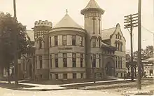 The building is 2½ stories and built with a mix of Mission Revival Style, Spanish Colonial Revival, and Richardsonian Romanesque architecture.[2] It is constructed of brick and sandstone, and measures 70 feet by 70 feet. Standing on a corner lot, the building has two main entrance facades. Both entryway are through massive arches, 18 feet high and 17 feet wide, trimmed with carved sandstone. Near each entryway is a tower, one rising 66 feet and the other 44 feet. A semi-circular room pushes outward on the corner between the towers.[5]