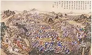 Attacks on the Qing began in earnest approximately twenty years later in 1820. At that time, Jāhangīr Khoja, the son of Sarimsaq, proposed to the ruler of Khoqand, Umar Khan, that they join as allies and launch a holy war against the Qing.[17] When the proposal was rejected by Umar Khan, Jāhangīr independently led some 300 soldiers on a raid to capture Kashghar. Jāhangīr's forces clashed with the Qing, but were forced to end the expedition even before reaching the gates of the Gulbagh fortress near Kashghar.[18]