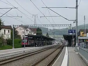 On the Zug side there are three sidings, which are rarely used, and a former siding from the OVA site. The old station with its two platform tracks was completely rebuilt in 2001.[3] The level crossing at the OVA site was abolished and replaced by a bicycle and passenger underpass. The station received a third platform track and all buildings were replaced. The station forecourt was rebuilt and a bus station was built. The integrated bus terminal has eight stops for the provisional six bus routes to the region as well as to Cham, Zürich, Muri and Thalwil. In September 2002, the current station was inaugurated with a festival.[4][5]