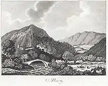 Sketch showing a bridge over the Afon Aber, mountains and cottages