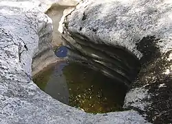 The Aiguillon goes dry during the summer, but has carved out a rocky gorge called Les Concluses on the limestone plateau. From a viewpoint high above, the gorge is riddled with deep geological structures known as marmites des géants (potholes). In summer it is popular with walkers, who follow the water course under the steeply overhanging limestone valley sides. The walls of the gorge have many climbing routes of an average 8a difficulty. Similarly, the walls of the valley contain many caves and potholes. The largest one is the "Baume du Biou," or the Grotto of the Ox.