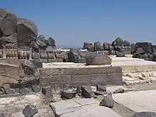 A courtyard built with sandstones provides the approach to the temple. The courtyard is paved with flagstones where a chalkstone basin for ceremonial purposes is seen.[4] The temple, 30 by 20 m (98 by 66 ft) in size, faces southeast.[3][4] Its exterior contains a cherubim relief.[14] The entrance porch, or portico, marked by two basalt piers or pillars, and a wide hall, were not roofed over and were part of an open courtyard. The entrance pillars appear to have architectural and cultic significance.[3] A sphinx and two lions decorate the temple portico flanking the three steps (out of four) made from basalt.