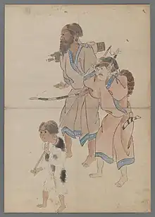 The policy of the Matsumae domain was that the Ainu should "not be influenced by the culture of Japan", and the Ainu did not use the Japanese language or accessories like the kasa (hat), mino (straw cape), or zori (sandals), or other Japanese-style clothing.[27] However, when the territory came under the direct control of the Edo shogunate, the ban on wearing hats, coats, and sandals, which had been forbidden by the Matsumae clan, was lifted. At the same time, the Shogunate recommended changing their hairstyle, clothes, and names to the Japanese style. However, it did not become very popular.
