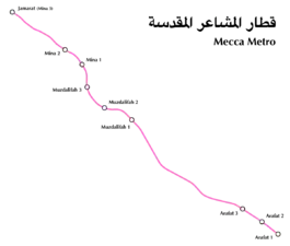 The Al Mashaaer Al Mugaddassah Metro Line, (English: The Sacred Sites Train Southern Line)(Arabic: قطار المشاعر المقدسة الخط الجنوبي qtar al mashaaer al muqaddassah al khat diljanubi) is a metro line in the city of Mecca, Saudi Arabia. Claimed to have the highest capacity of any metro in the world, it operates for seven days a year, and is used exclusively as a shuttle train for pilgrims between holy sites in Mecca, Mount Arafat, Muzdalifah and Mina to reduce congestion caused by thousands of buses and cars during the Hajj. It is the second metro system on the Arabian Peninsula, after the Dubai Metro (although, with its limited open hours, some consider it more of a shuttle train service).