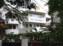 The DENIS bank design was highly appreciated after which their office received another contract in 1936 to redesign the famous hotel in Bandung, the Savoy Homann Hotel. The hotel was built in 1880 and had been the major accommodation for the wealthy. F Van Es Jr., the hotel owner, asked Aalbers to renovate the hotel with a similar elastic impression as in the DENIS bank. The ocean wave facade and the vertical tower in the middle thus decorate the hotel's exterior, while Aalbers kept the colonial classical style for the interior. The hotel was reopened in 1939 and became internationally renowned. Several Hollywood artists have stayed in the hotel, including Charlie Chaplin and Mary Pickford.[3]