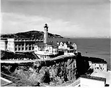 Alcatraz Island Lighthouse is a lighthouse—the first one built on the U.S. West Coast—located on Alcatraz Island in California's San Francisco Bay.[4] It is located at the southern end of the island near the entrance to the prison.[5] The first light house on the island was completed in 1854, and served the bay during its time as a Citadel and military prison. It was replaced by a taller (95 feet (29 m) above mean sea level) concrete tower built in 1909 to the south of the original one which was demolished after it was damaged due to earthquake in 1906. The automation of the lighthouse with a modern beacon took place in 1963, the year Alcatraz closed as the Alcatraz Federal Penitentiary. It is the oldest light station on the island with a modern beacon and is part of the museum on the island.[4][5] Although when viewed from afar it easily looks the tallest structure on Alcatraz, it is actually shorter than the Alcatraz Water Tower, but as it lies on higher ground it looks much taller.
