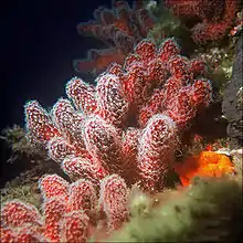 Red dead man's fingers is a colonial coral forming clumps of red fleshy masses of finger-like lobes. The surface layer include many sclerites which form a crust.[2] The individual polyps are white and translucent, and project from the leathery surface when feeding, giving the colony a furry appearance.[3] By swallowing or ejecting water an entire colony can expand or shrink considerably.