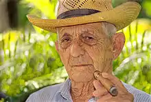 During the 1990s, Robaina was recognized by the Cuban government as the country's best tobacco grower.[1] In 1997, Vegas Robaina cigar brand was created by the Cuban government-owned company Habanos S.A. to honour Robaina's accomplishments in the industry,[1][4] although cigar experts have had a hard time detecting Robaina's tobacco in the cigar and Robaina himself never provided a definitive answer.[1] Robaina is the only tobacco grower with a Cuban cigar named after himself and has spent several decades travelling the world as Cuba's unofficial tobacco and cigar ambassador.[7][8] His travelling subsided as he got older and he received visits at his home and plantation by thousands of cigar enthusiasts and tourists annually.[4][1]