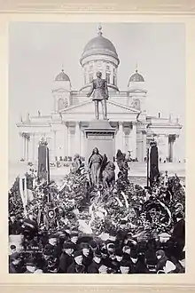 Emperor Alexander II (1818-1881) was a ruler beloved by the Finns, whose reign and influence helped to produce significant societal changes.[3] He died in 1881 as a victim of a bombing assassination, and in 1884 the Diet of Finland held a design contest for a monument placed at the Senate Square. All notable Finnish sculptors at the time were invited to the contest.[4]