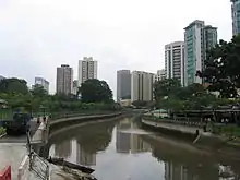 Alexandra Canal is one of the upper reaches of the Singapore River and Sungei Pandan, becoming the Singapore River after Kim Seng Bridge.[1] The 1.2 km long canal stretches from Tanglin Road to Delta Road. Reconstruction of Alexandra Canal between Tanglin Road and Kim Seng Road took place from 1997 to 2008 to improve the structural condition of the canal and to alleviate flooding in the catchment. In 2011, a 250-metre stretch of Alexandra Canal, between Zion Road and Kim Seng Road, was reconstructed to improve drainage and prevent floods.[2] A 200m stretch of the open waterway near Tanglin Road was decked over to create a water cascade and water play area. The deck also provides a point from which the public can have a view of the waterway downstream.