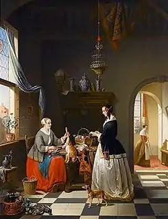 His works consist mainly of interior genre scenes, rendered in great detail. Most of them feature 17th-century settings, in the style of the old Dutch masters; especially those known as the fijnschilders. The physical details of his rooms and furnishings owe much to Gerrit Dou.