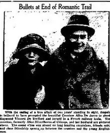 - 1 2 "AMERICAN COUNTESS SHOOTS ENGLISHMAN AND SELF IN PARIS; Former Alice Silverthorne of Chicago and Raymond de Trafford in Grave State. ESTRANGED FROM HUSBAND Shooting Takes Place on Train Just Before Departure for Cross-Channel Steamer". The New York Times. 27 March 1927. Retrieved 29 July 2021.