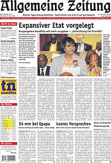 The Allgemeine Zeitung is a Namibian newspaper. It is written by 10 editors; most of the staff members are either born or naturalized Namibians. It is read mostly by German-speaking Namibians (~15,000).[2] The newspaper leans liberal-conservative.[3]