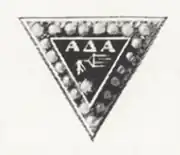The badge of Alpha Delta Alpha was an equilateral triangle, one point down, having a border of 21 pearls. The inner triangle was formed of black enamel with a single pearl, a radio antenna, and the letters Α, Δ and Α.