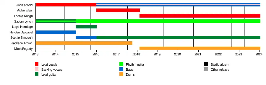 On 9 February 2018, lead vocalist Aidan Ellaz was ejected from the band due to allegations of sexual assault, which were later proved to be false. In June 2018, Lochie Keogh and Mitch Fogarty were announced as new members.[5]