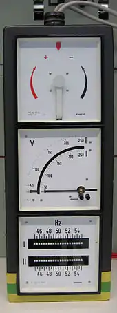 From top to bottom: synchroscope, voltmeter, frequency meter. When the two systems are synchronized, the pointer on the synchrosope is stationary and points straight up.