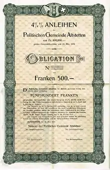 Bond of the Politischen Gemeinde Altstetten, issued 20. March 1910