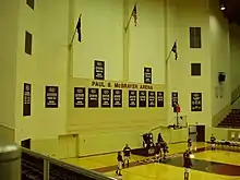 Built in 1963, the Paul S. McBrayer Arena located inside Alumni Coliseum, is capable of seating around 6,500 people in both chairback seats and on wooden benches (8,000 for concerts) arranged in a horseshoe shape, facing a wall at the right side of the arena where staging is usually set up for events. The arena's ceiling is made completely of wooden beams and is believed to be the largest of its kind in existence. It was named for the former EKU Men's Basketball Coach Paul McBrayer who compiled a record of 219–144. The floor graphics were updated for the 2005–06 seasons and the banners were redone to be more unified. The building replaced Weaver Gymnasium, which had been home to the Colonels since 1930.