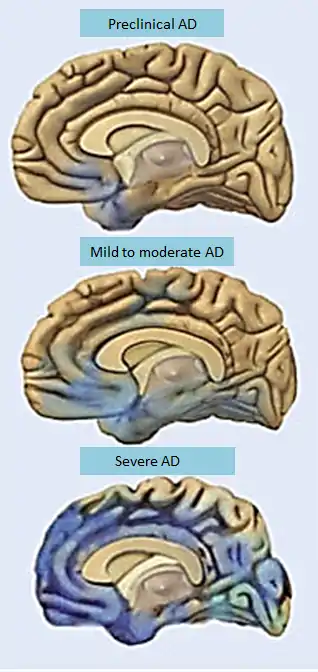 - AD progresses in a typical pattern, beginning in the entorhinal cortex in the preclinical AD, spreading to other regions affecting memory, then function and other cognitive abilities in mild to moderate AD and finally severe AD (Figure 1).