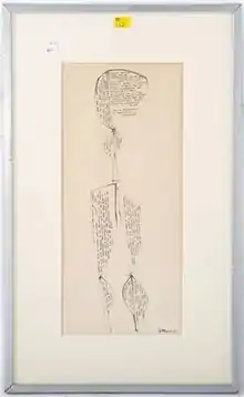 During the years in which sculpture dominated her output she continued to make quick and spontaneous works on paper, both drawings and watercolors.[10] One of these drawings, "Art Quotes" (1966) can bee seen at right. Shortly before her death she made a return to figuration in a set of small works on paper prepared for a solo exhibition at the C.Grimaldis Gallery called "Artist and Model." A critic said that in these works (in ink, watercolor, and oil) she explored how the models the artists depicted could be "reduced to their definitional lines," showing them as compositional elements rather than living beings.[22]