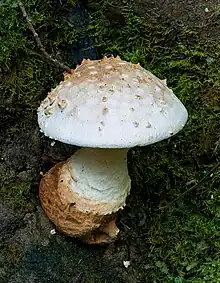 The fruit body has a pale brown cap that is initially convex before flattening with maturity to almost flat or even depressed in the centre. It is covered in prominent small warts which are roughly cone-shaped. The gills are pale orange-yellow. The brownish-white stalk is up to 10 centimetres (4 inches) high and 2.6 cm (1 in) wide with a prominent bulb up to 4.5 cm (2 in) in diameter. The ring is off-white and prominent but may fall off older mushrooms. The globular spores are amyloid and measure 7–10 by 5–8 μm.[2]