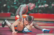 ![]() Two wrestlers competing in an amateur wrestling match | |