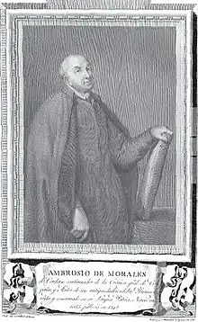 Ambrosio de Morales (Cordoba, Spain, 1513 – ib., September, 1591) was a historian. After his studies at the University of Salamanca and Alcalá, he took Holy orders. Soon he was elected to the chair of Belles-Lettres at Alcalá. In 1574 he was appointed chronicler of Castile and commissioned to continue Florián de Ocampo's Crónica General de España. This he brought down, after ten years of labour on it, to the date of the union of Castile and León under Ferdinand I. His pupil Sandoval continued it down to 1079.