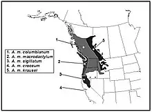 The 'eastern' subspecies (A. m. krausei) range is distributed throughout the interior mountains, with the western extent of its range encroaching into the low-land areas of the central interior plateau of Washington and British Columbia and the eastern extent of its range pushing through Rocky Mountain valleys into the lowland foothills and prairies of Montana and Alberta.[25][11]